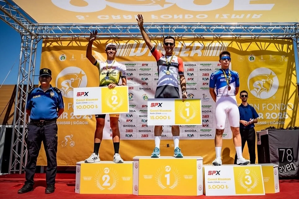 Mudanya Belediyespor'dan Gökhan Uzuntaş, İzmir Sığacık'ta düzenlenen Granfondo İzmir Yarışları'nda 92,9 km'lik parkurda 2 saat 53 dakika 44 saniye ile birinci oldu.